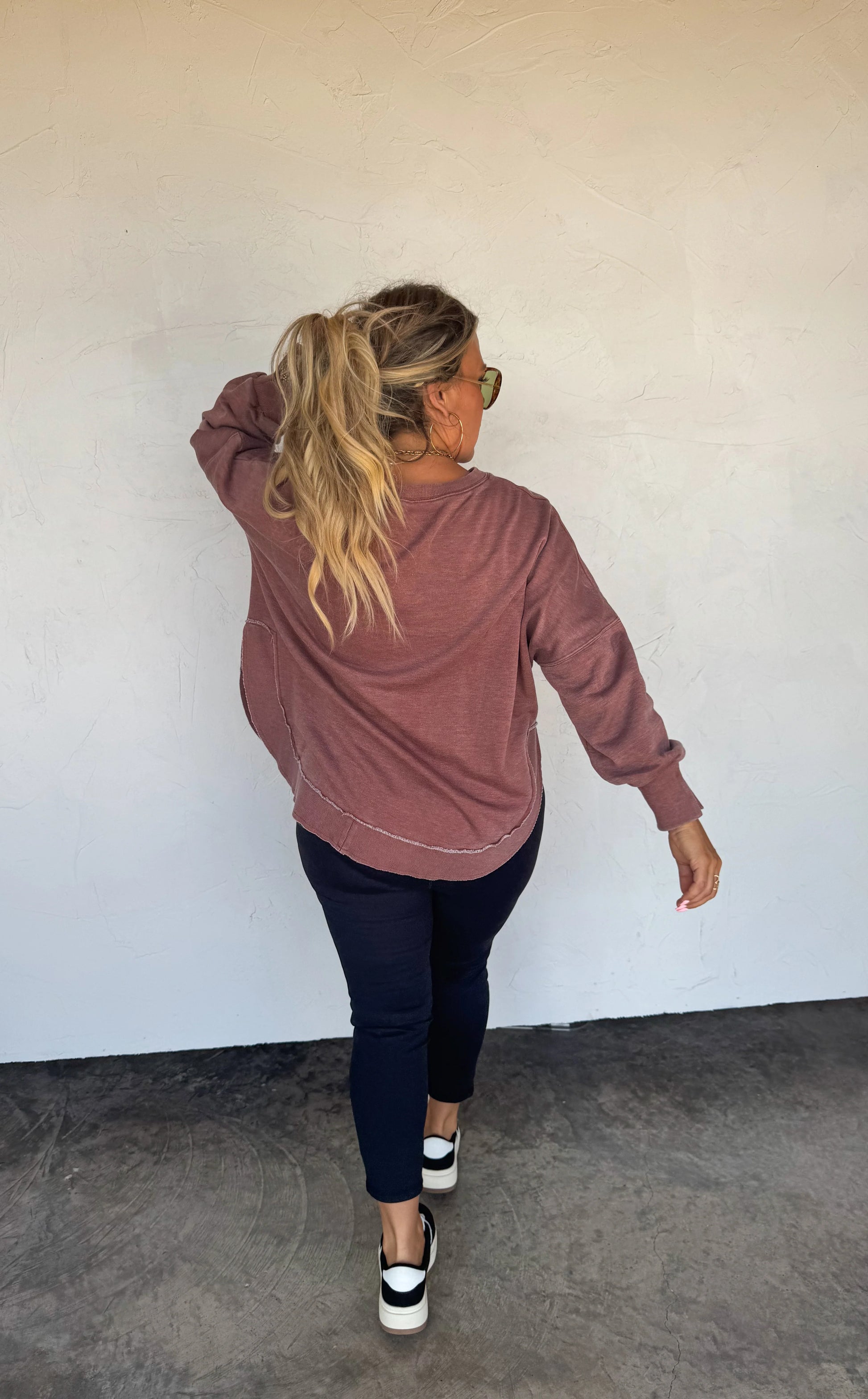 The perfect washed cotton flattering sweatshirt that everyone needs! Faded “vintage” colors. Features flattering rounded front and back hem with side slits!